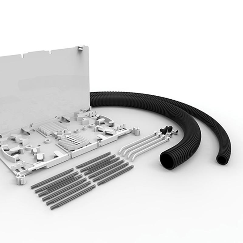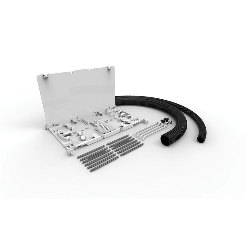 "Compostos por bandejas de emenda, filme plástico protetor, parafusos de fixação, protetores de emenda, braçadeiras plásticas de fixação e etiquetas de identificação das emendas, os kits estão disponíveis para 12, 24, 36 ou 48 fusões.