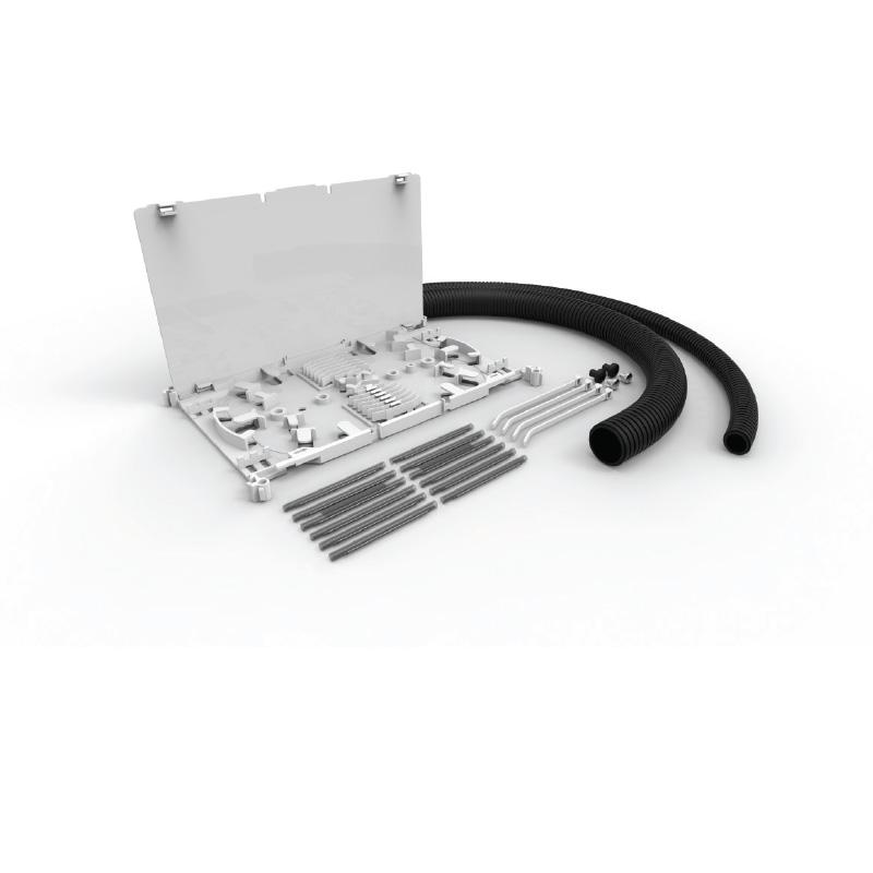 Compostos por bandejas de emenda, filme plástico protetor, parafusos de fixação, protetores de emenda, braçadeiras plásticas de fixação e etiquetas de identificação das emendas, os kits estão disponíveis para 12, 24, 36 ou 48 fusões.