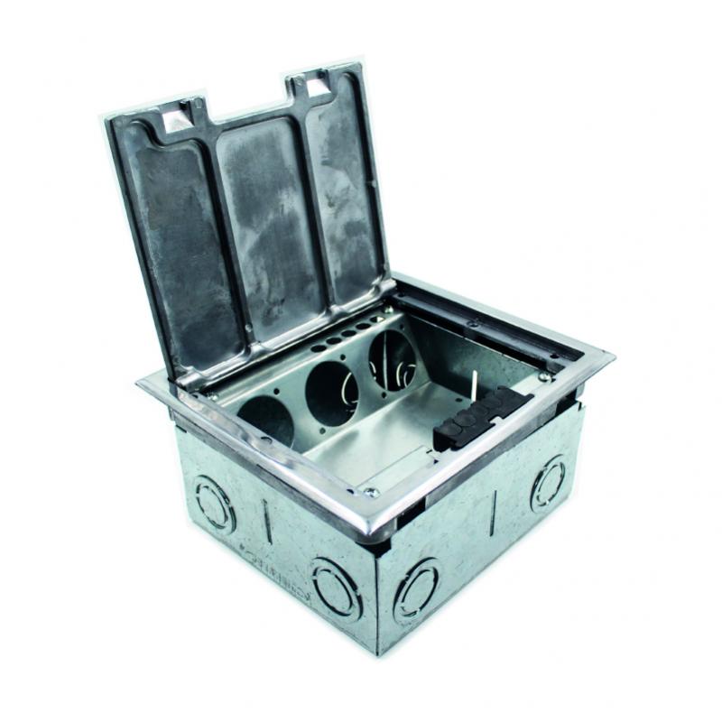 A caixa é composta por um fundo em chapa de aço galvanizado e pelo conjunto colarinho e tampa, fabricados em alumínio injetado. Pode ser utilizada como caixa de passagem ou em conjunto com um adaptador interno, que permite a utilização de tomadas elétricas ou de telecomunicações.