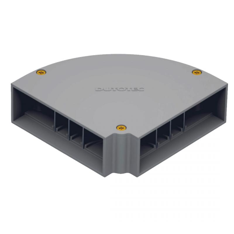 A curva para instalações aparentes é fabricada em alumínio injetado, composta por duas partes fundamentais: a base e a tampa. Essa construção bipartida facilita a passagem dos cabos elétricos e permite a instalação após a conclusão da infraestrutura. Destaca-se pela presença de septos internos móveis, conferindo flexibilidade de configuração para organizar e direcionar os cabos conforme as necessidades da instalação.