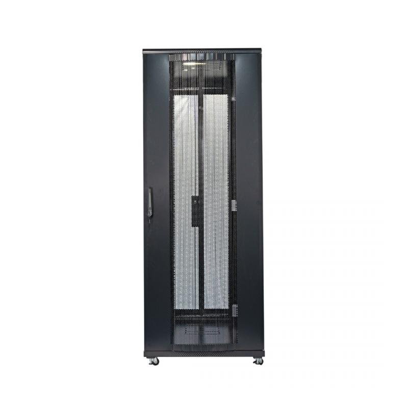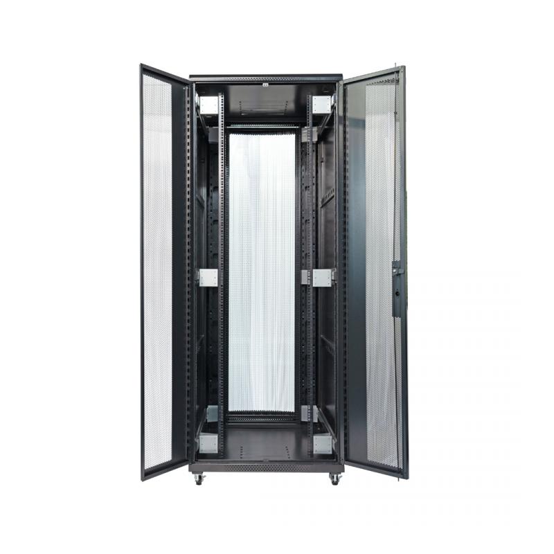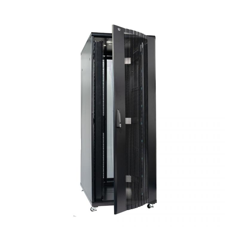 Rack Servidor desmontável 19", ideal para servidores e datacenters, projetado para acomodar cabeamento estruturado e equipamentos de rede e TI. Atende às normas ANSI/EIA RS-310-D, IEC297-2, DIN41494 e outras. Possui grau de proteção IP20, portas perfuradas padrão colméia (frontal e traseira), e ventilação de 75%.