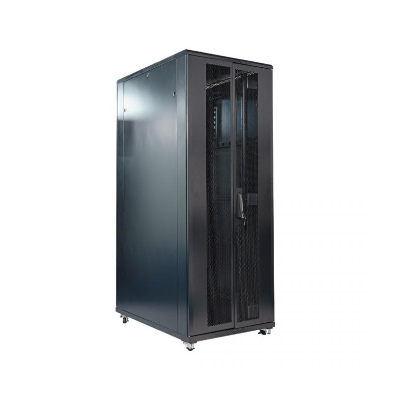 Estrutura robusta com fechamento elegante, fechadura nas portas e carga estática de 800 kg. Fabricado em aço SPCC de alta qualidade, com espessuras de 2mm, 1,5mm e 1,2mm, e pintura epóxi microtexturizada RAL 9004. Inclui aterramento, pés niveladores e kit rodízio. Dimensões: 44U de altura útil (2140 mm de altura externa c/ rodizio), 600mm de largura e 1100mm de profundidade.