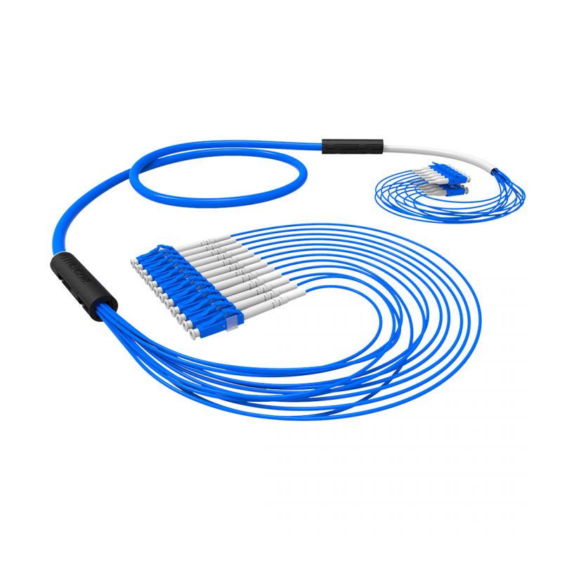 Disponível montado nas duas extremidades com conectores ópticos MPO ou montado com conector MPO em uma extremidade e conectores monofibra na extremidade oposta.