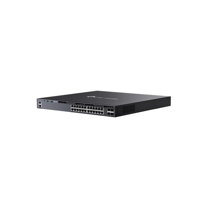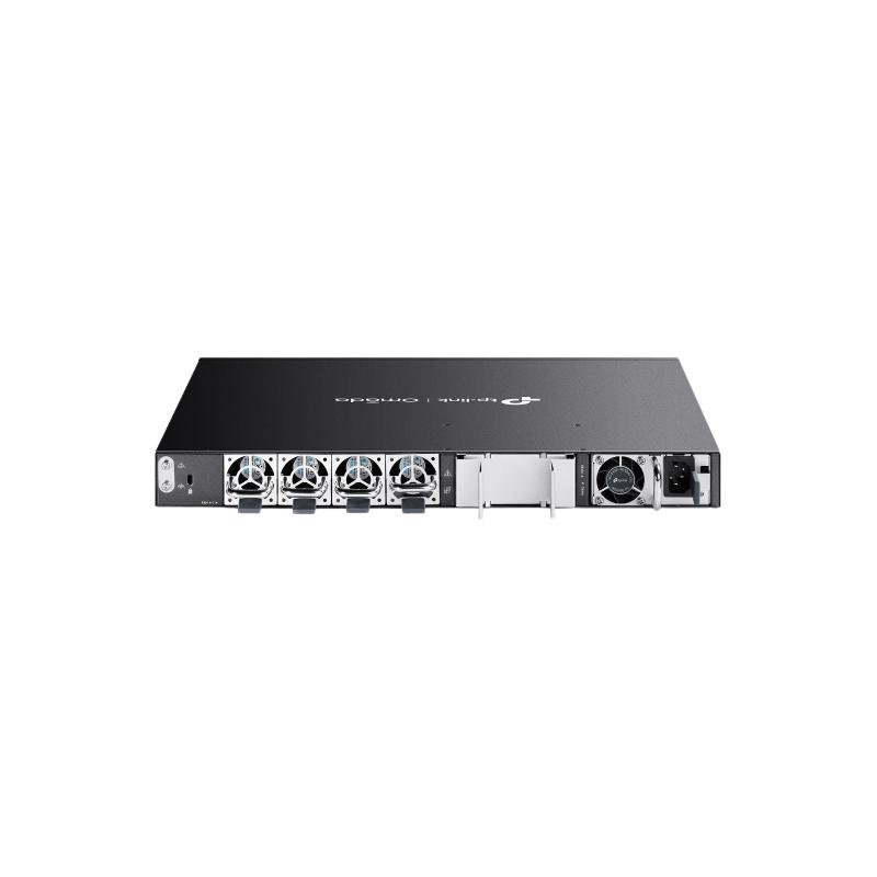 Projetado para alta disponibilidade, possui fontes redundantes substituíveis em campo e suporte a VRRP e ERPS. O gerenciamento pode ser feito de forma centralizada em nuvem via Omada SDN ou independente (Web, CLI, SNMP e RMON).